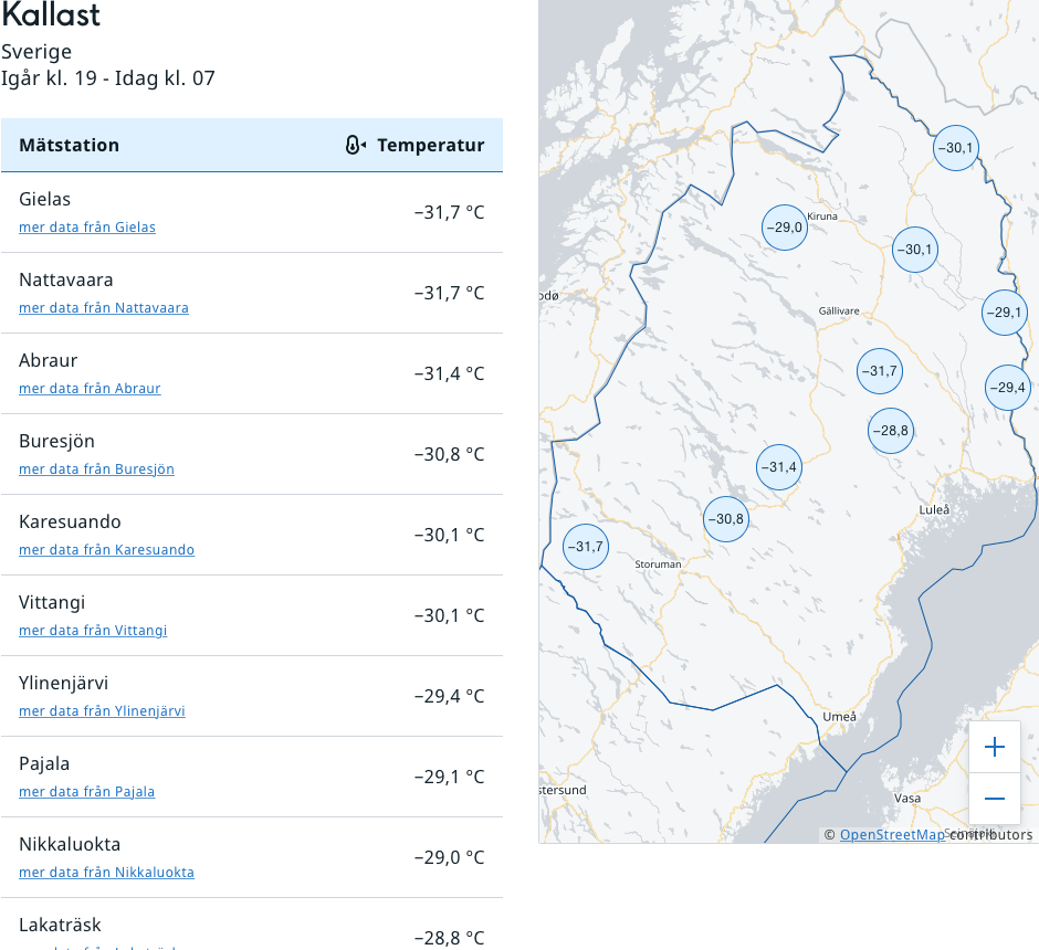 MinN: Gielas+`Natta -31,7 Abraur -31,4 Buresjön -30,8 nNo: are+Vittangi -30,1 Dravagen -20,6 Hedevik -20,5 Särna -20,8 Malung -19,2 Gustavsf -17,5 Kärna -10,3°
