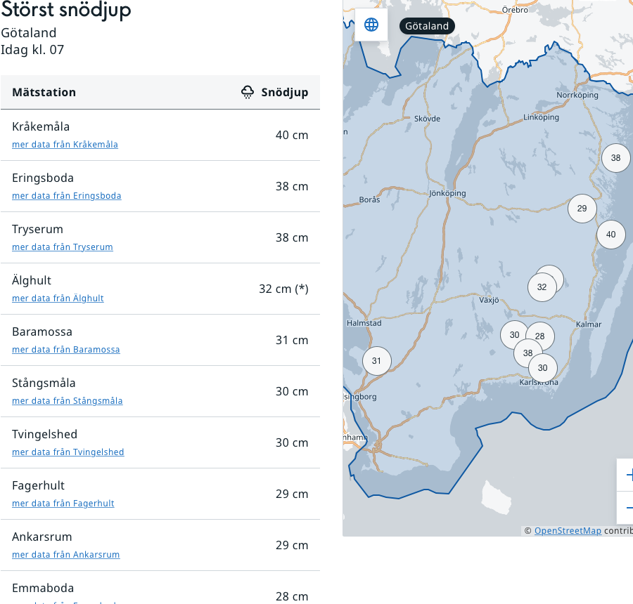 Göta: OBS Snökaos..: Kråkemåla 40 Eringsboda+Tryserum 38 Älghult 32 Baramossa 31 Stångsmåla+Tvingelshed 30 Fagerhult+Ankarsrum 29 Emma 28 cm