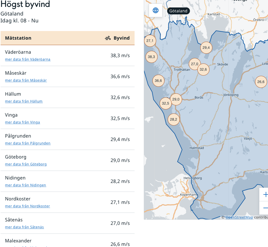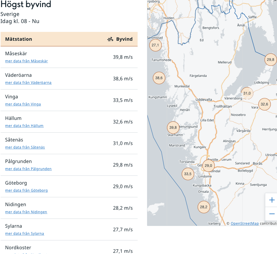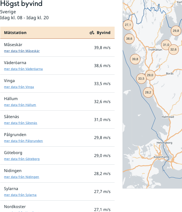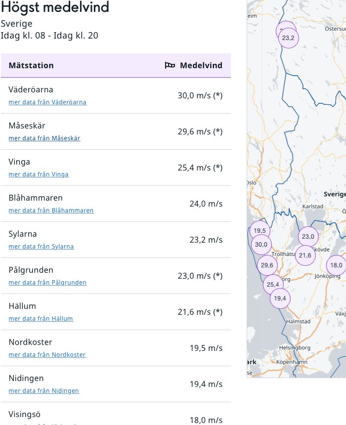Max by sön 08-12h: Hällum(V-göt) 29,6 Väd 28,4 Syl 27,7 Niding 26,7 NKoster 25,9 Vinga 25,1 Blåhamm 24,5 Landsort 17,8 IdreF+UppsF 15,0 m/s