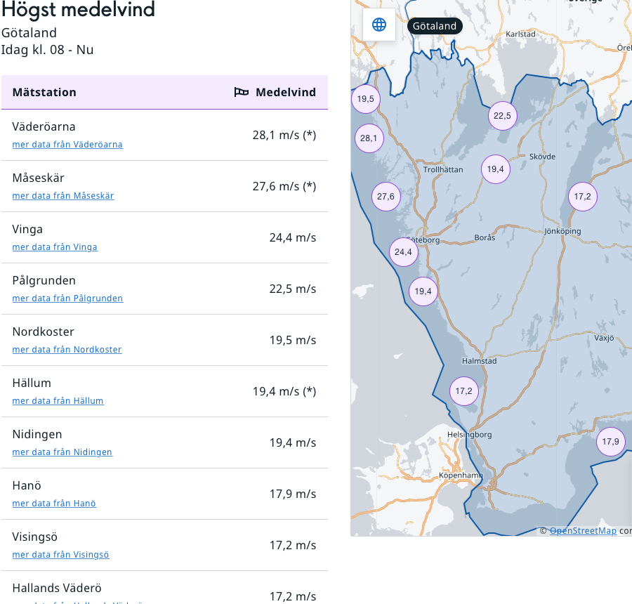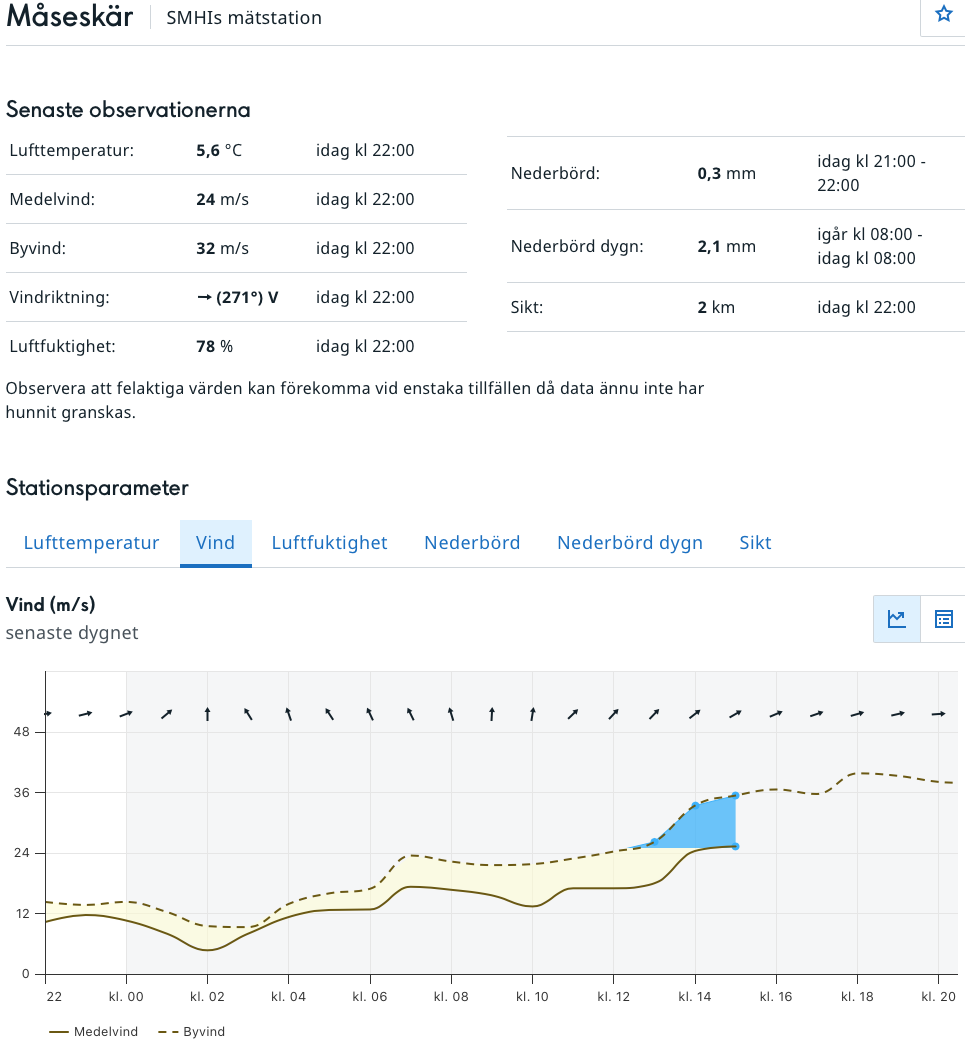 Max by sön 08-11h(kl är 12): Vinga 24,7 Väd 23,8 Måse 22,9 NKoster 22,3 Landsort 14,2 Blåhamm 23,4 m/s