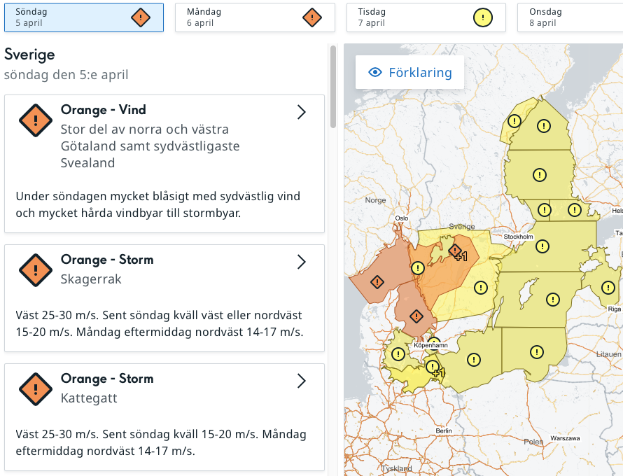 260405S Påskdagen STORMVARNING V-SV 25-30 m/s (108 km/h) medelvind söndag fm Västkusten/Skagerrak