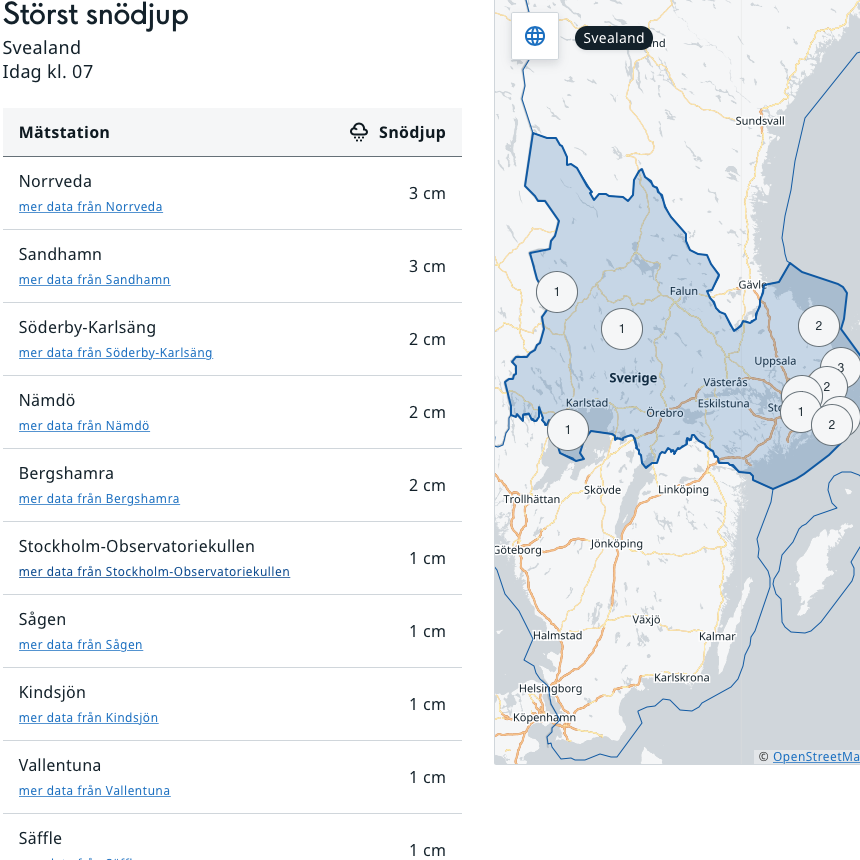 Svea (åter snö sedan 23 dec, senast Ti16) Lesjöfors+Gräsås:: 2 (2) Kopparberg (övr 1 cm i går ej med nu) 1 (1) Sågen Kindsj Hillersboda Hälleforsn Väse Östervåla Rimbo 1